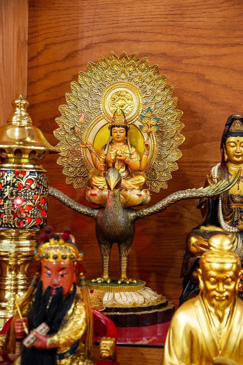 Peacock Yamashina Buddha is a protective deity in Esoteric Buddhism, symbolized by the peacock, which represents the ability to transform poison into nourishment. Invoked for purification and healing, he is prayed to for protection against illnesses, calamities, and negative energies. His association with renewal and vitality makes him a key figure in rituals for physical and spiritual cleansing.