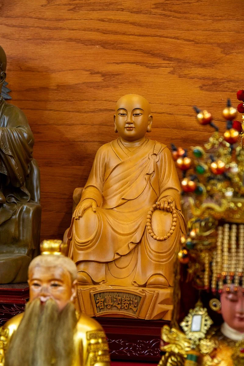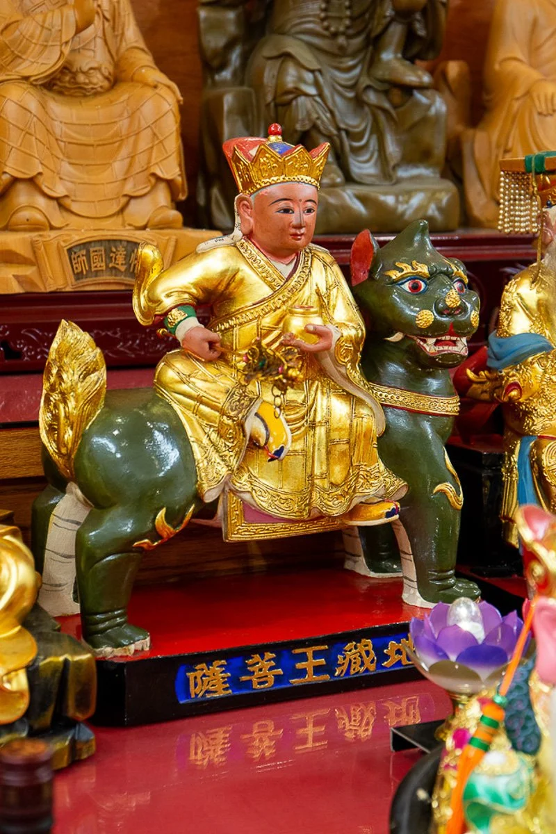 Kṣitigarbha Bodhisattva is renowned for his vow: "Until hell is empty, I will not become a Buddha." He is a protector of beings in the afterlife, particularly those in hell realms, working tirelessly to alleviate their suffering and guide them toward liberation. Depicted with a monk’s staff, which symbolizes opening the gates of hell and breaking through obstacles, and a wish-fulfilling jewel, signifying the granting of blessings and spiritual illumination, he is deeply venerated during the Ghost Festival and other rites for the deceased. Worshipers pray to Kṣitigarbha for the well-being of departed loved ones, protection during times of loss, and the cultivation of virtue.