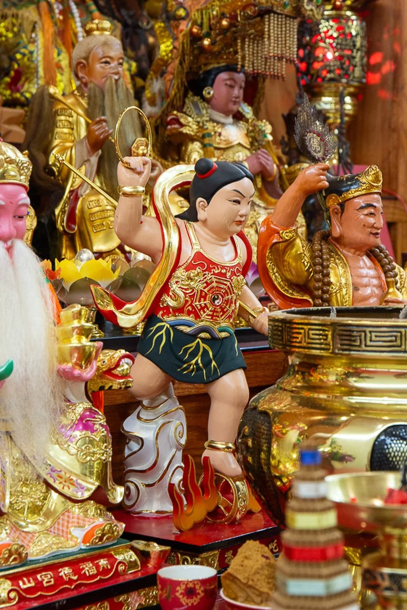 Also known as the Marshal of Central Altar or Nezha, is a youthful deity celebrated for his bravery, loyalty, and combat skills. Depicted riding fiery wheels (symbolizing swift action) and wielding weapons like the fire-tipped spear and the cosmic ring (representing balance and justice), he embodies the spirit of heroism and protection. Children, young warriors, and those in need of courage often pray to him for strength, success in challenges, and protection from evil forces.