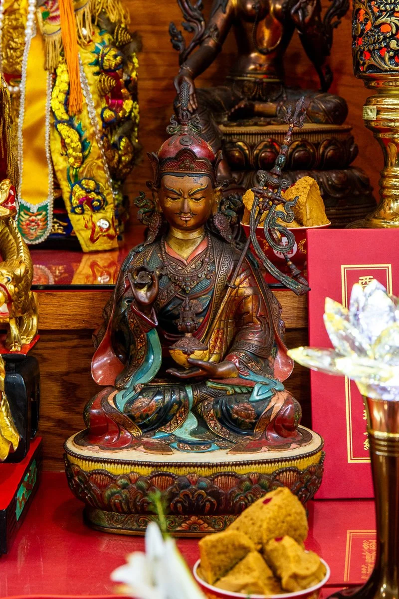 Padmasambhava, known as Guru Rinpoche, is credited with bringing Buddhism to Tibet and mastering tantric practices. Often depicted seated on a lotus and holding a vajra and a skull cup, symbols of enlightenment and spiritual power, he is revered as a protector of the dharma and a guide in overcoming challenges. Worshipers pray to him for wisdom, protection, and success in spiritual endeavors.